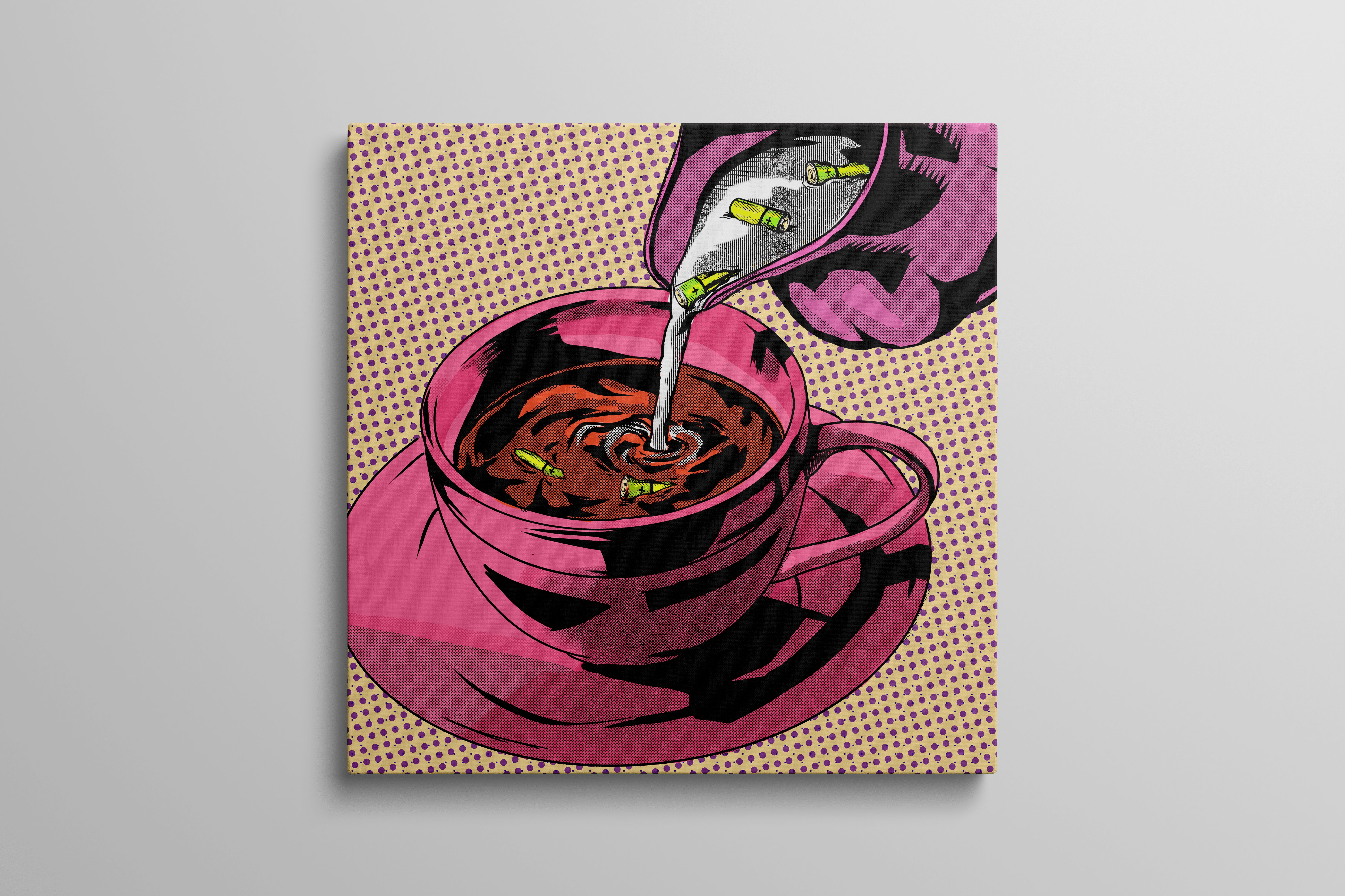 With bold comic aesthetics, this illustration literalizes a universal feeling: running on empty. It explores the visual parallel between mechanical energy and biological fatigue, positioning the coffee cup as the ultimate power source for the human machine.
