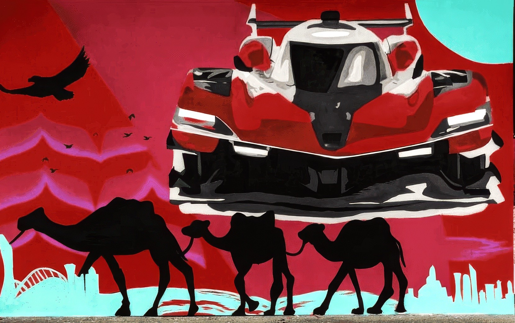 Cultural Synthesis: A dynamic blend of high-speed racing motifs and local artistic heritage.